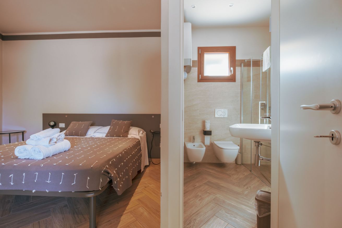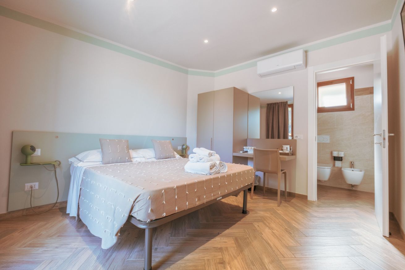 Questa camera matrimoniale al piano terra è dotata di un letto matrimoniale e gode di tutti i comfort come aria condizionata, bagno privato con doccia, TV e wi-fi.