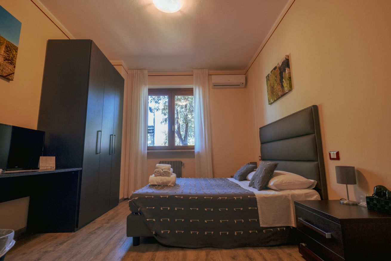 Questa camera matrimoniale al piano terra è dotata di un letto matrimoniale e gode di tutti i comfort come aria condizionata, bagno privato con doccia, TV e wi-fi. Su richiesta è possibile aggiungere un lettino.