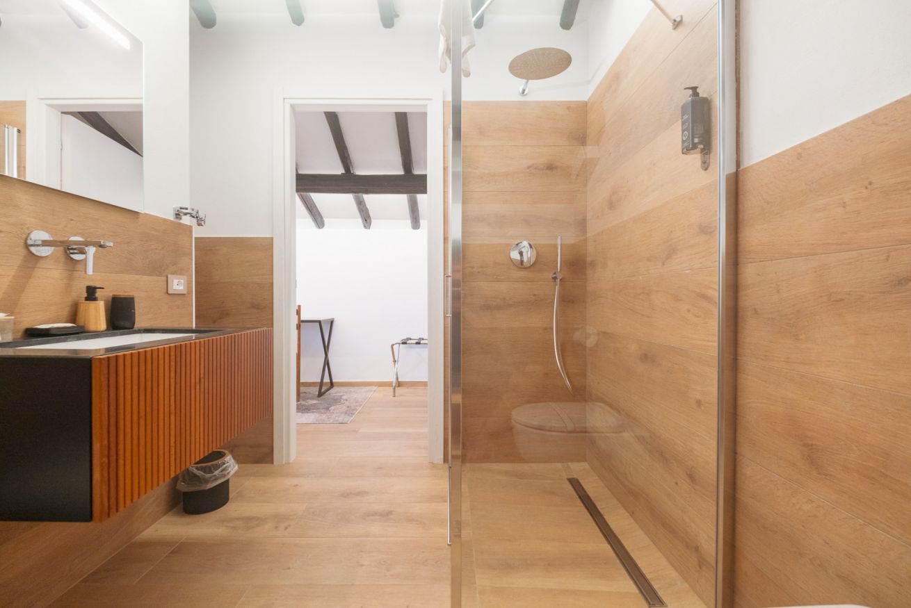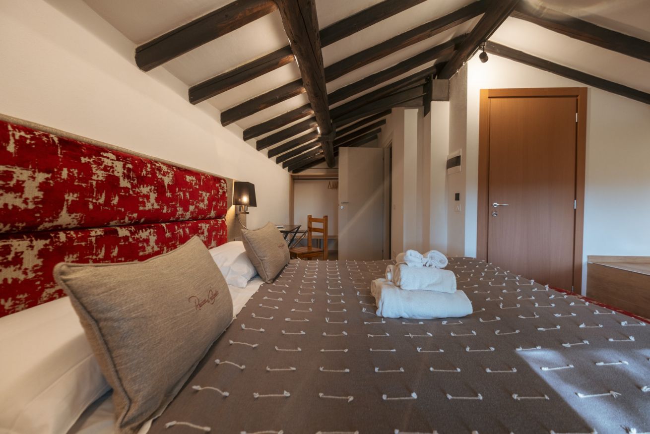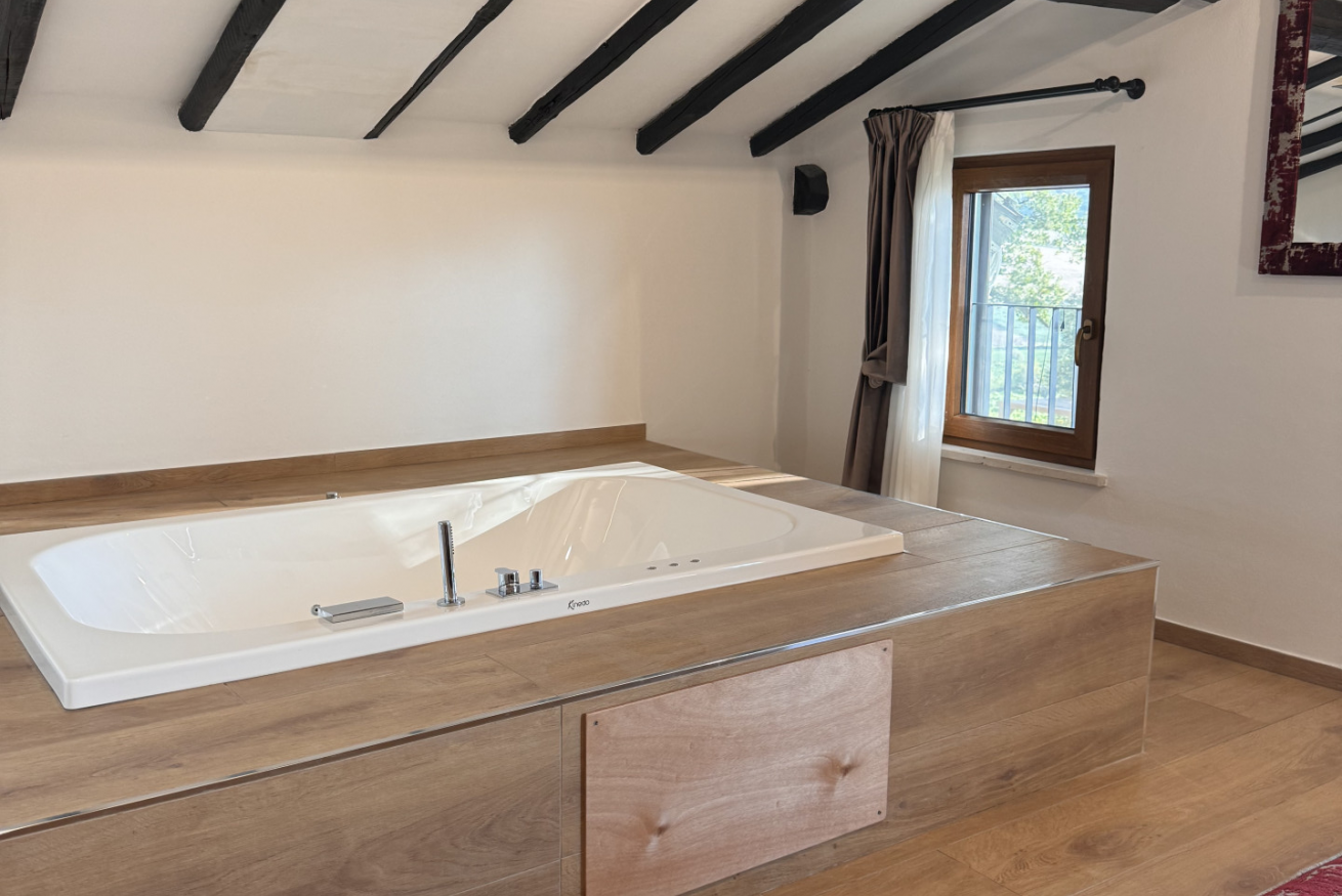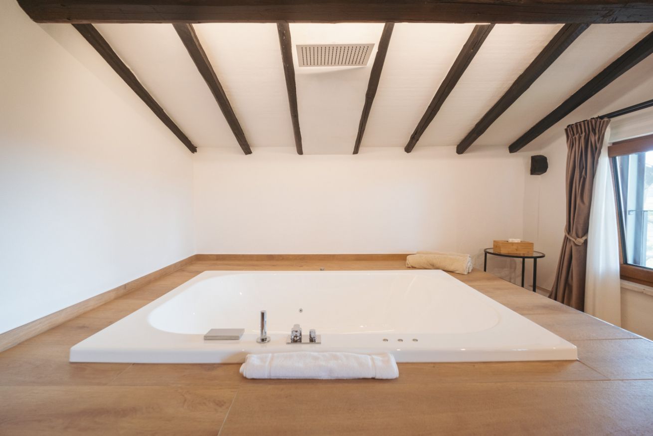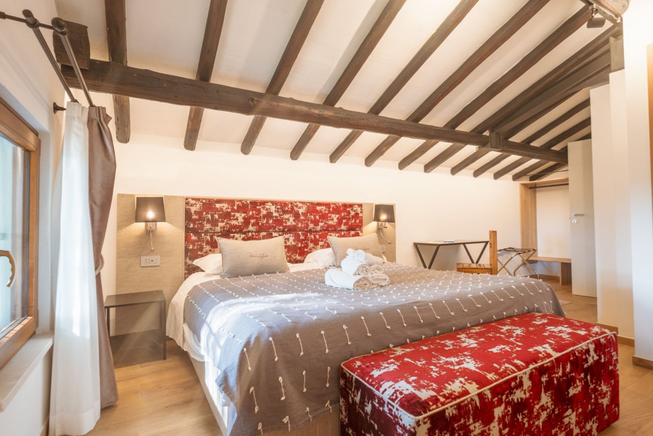 Questa nuovissima camera di 30 mq, inaugurata nel 2024, è composta da una zona notte con letto matrimoniale, un idromassaggio privato ed un bagno completo con doccia.